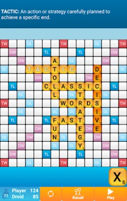 Choose the skill level of the computer (from beginner to expert), pick a word list (English word lists include the latest NASPA Word List 2020), and use your strategy skills and vocabulary to try and defeat the Droid.