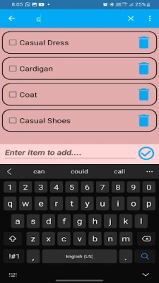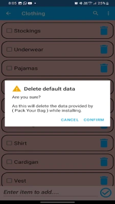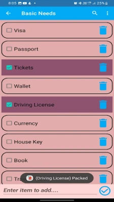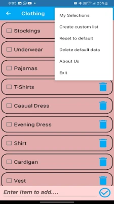 Add or remove item from travel list. You can create your own travel list. Add missing items and categories not found in the storage.